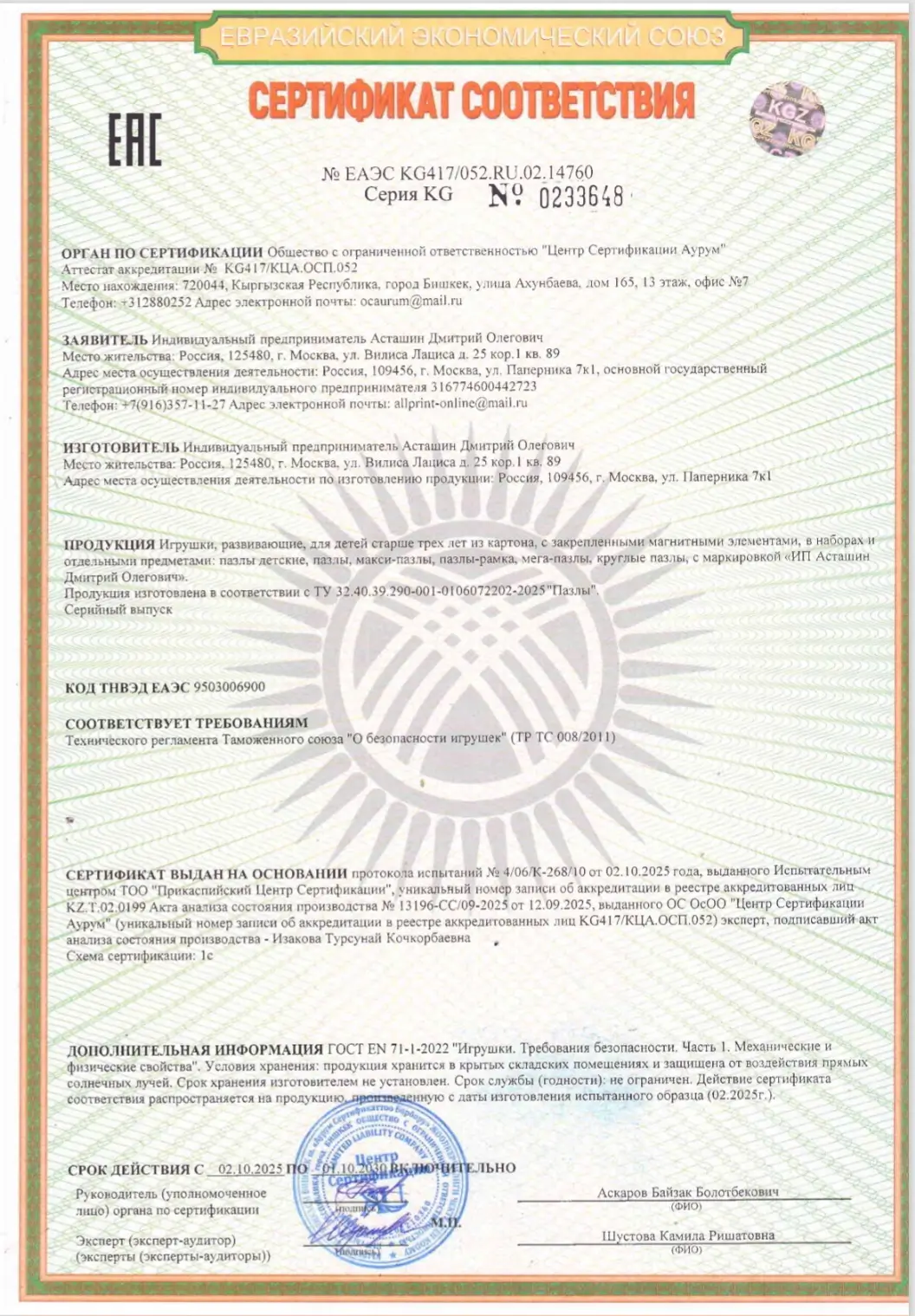 Наши пазлы полностью безопасны для детей от 3х лет и соответствуют требованиям ЕАС